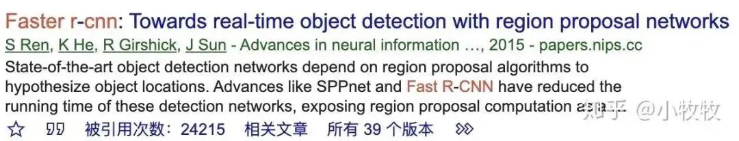 Zisserman在2014年发表的关于VGGNet的文章Very deep convolutional networks for large-scale image recognition,目前的引用量是48691次。Google在2015年发表的关于GoogLeNet的文章Going deeper with convolutions,目前的引用量是26353次。何凯明2016年的文章Deep residual learning for image recognition,提出的多达152层ResNet,目前的引用量是63253次。2016年提出的用于目标检测的Faster R-CNN,目前的引用量是24215次。