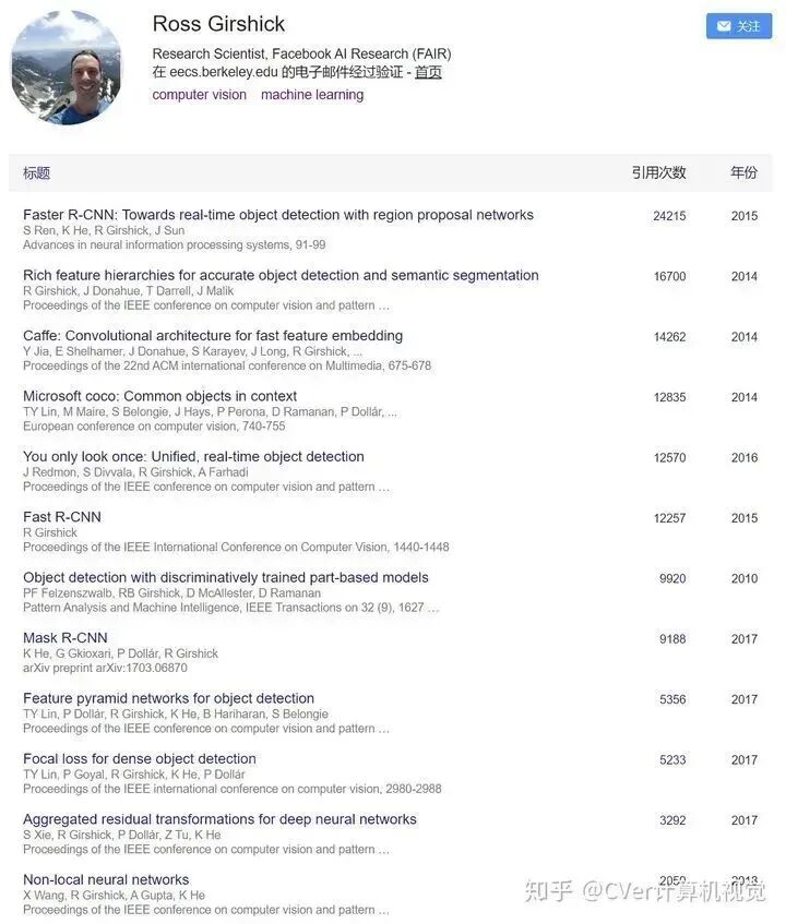有鼎鼎大名的R-CNN系列工作,合作的有Caffe、Mask R-CNN、Focal Loss、FPN和YOLO等工作。