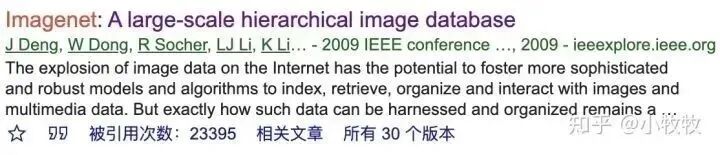 女神李飞飞构建的ImageNet是计算机视觉(Computer vision)领域非常著名的大型数据集,关于ImageNet的论文ImageNet: A large-scale hierarchical image database发表时间是2009年,目前的引用量是23395次,AlexNet就是在2012年ImageNet大规模视觉识别挑战赛(ILSVRC)上一举成名,自此点燃了深度学习的热潮,可见大规模数据对于深度学习的重要性。