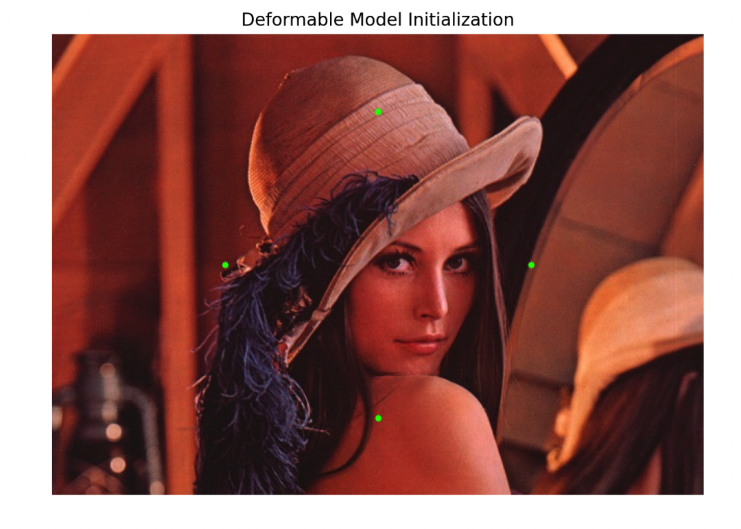 import cv2import numpy as npimport matplotlib.pyplot as plt# 读取图像image = cv2.imread('image.jpg')gray_image = cv2.cvtColor(image, cv2.COLOR_BGR2GRAY)# 设置初始轮廓center = (gray_image.shape[1] // 2, gray_image.shape[0] // 2)radius = min(gray_image.shape) // 3initial_contour = np.array([[center[0] + radius, center[1]], [center[0], center[1] + radius], [center[0] - radius, center[1]], [center[0], center[1] - radius]])# 创建形变模型(蛇)snake = cv2.UMat(initial_contour)# 优化形变模型snake = cv2.UMat(cv2.convexHull(initial_contour))snake = cv2.UMat(snake)# 绘制结果result = cv2.cvtColor(image, cv2.COLOR_BGR2RGB)for i in range(len(initial_contour)): cv2.circle(result, (int(initial_contour[i][0]), int(initial_contour[i][1])), 3, (0, 255, 0), -1)# 显示结果plt.figure(figsize=(8, 6))plt.imshow(result)plt.title('Deformable Model Initialization')plt.axis('off')plt.show()