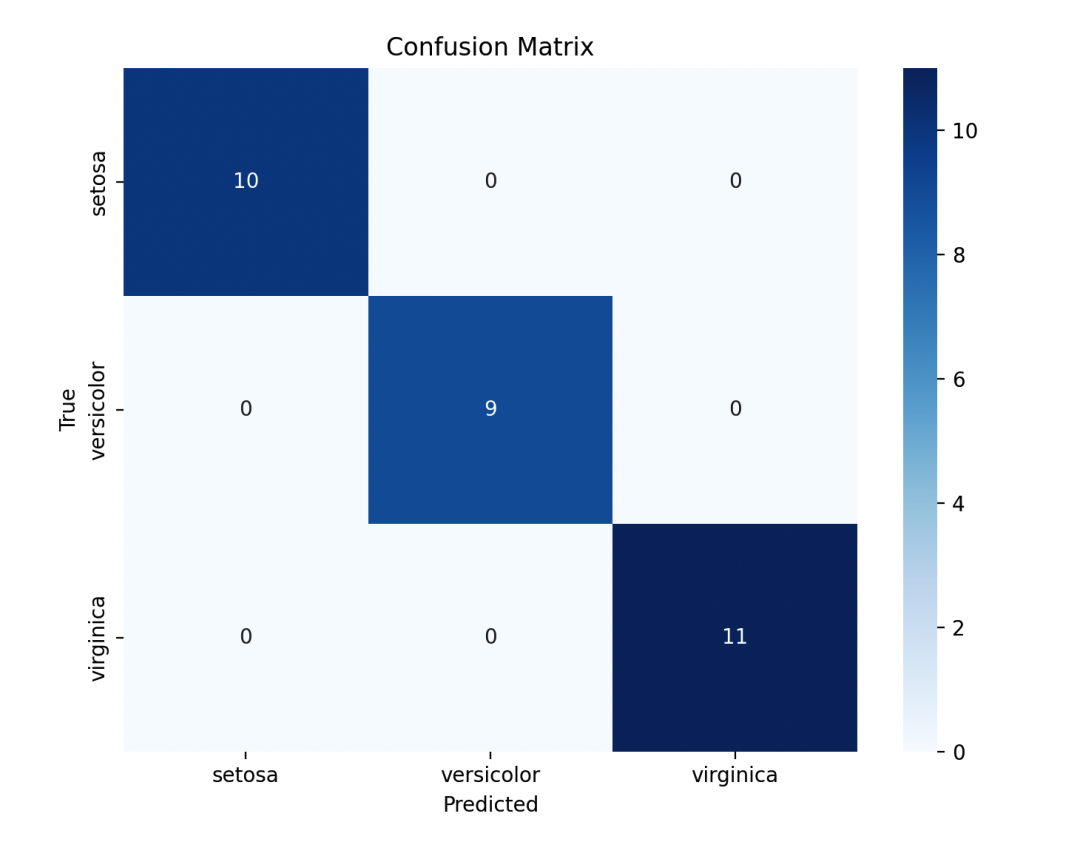 import xgboost as xgbfrom sklearn.datasets import load_irisfrom sklearn.model_selection import train_test_splitfrom sklearn.metrics import accuracy_score, confusion_matrix, plot_confusion_matriximport seaborn as snsimport matplotlib.pyplot as plt# 加载数据集iris = load_iris()X = iris.datay = iris.target# 划分训练集和测试集X_train, X_test, y_train, y_test = train_test_split(X, y, test_size=0.2, random_state=42)# 将数据集转换为DMatrix格式dtrain = xgb.DMatrix(X_train, label=y_train)dtest = xgb.DMatrix(X_test, label=y_test)# 设置参数params = { 'max_depth': 3, 'eta': 0.1, 'objective': 'multi:softmax', # 多分类问题的目标函数 'num_class': 3, # 类别数量 'eval_metric': 'merror' # 多分类问题的评估指标}# 训练模型num_rounds = 100bst = xgb.train(params, dtrain, num_rounds)# 进行预测preds = bst.predict(dtest)# 计算准确率accuracy = accuracy_score(y_test, preds)print("Accuracy:", accuracy)# 计算混淆矩阵cm = confusion_matrix(y_test, preds)# 绘制混淆矩阵plt.figure(figsize=(8, 6))sns.heatmap(cm, annot=True, fmt='d', cmap='Blues', xticklabels=iris.target_names, yticklabels=iris.target_names)plt.xlabel('Predicted')plt.ylabel('True')plt.title('Confusion Matrix')plt.show()