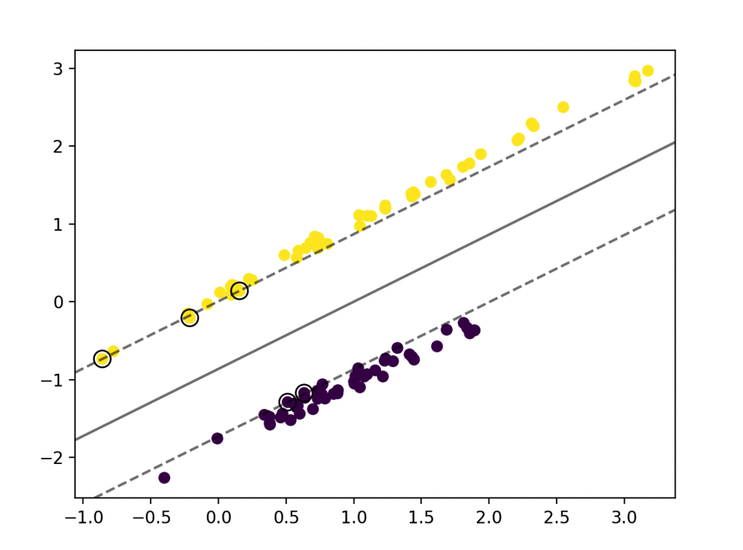 这段代码使用Scikit-learn库中的SVC模型进行训练,并绘制了数据点、决策边界、间隔边界以及支持向量的图示。