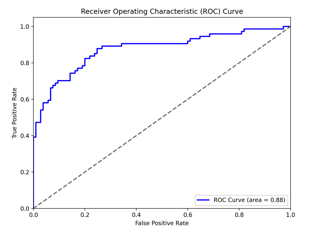 # 绘制ROC曲线from sklearn.metrics import roc_curve, roc_auc_scorey_prob = model.predict_proba(X_test)[:, 1]fpr, tpr, thresholds = roc_curve(y_test, y_prob)roc_auc = roc_auc_score(y_test, y_prob)plt.figure(figsize=(8, 6))plt.plot(fpr, tpr, color='blue', lw=2, label=f'ROC Curve (area = {roc_auc:.2f})')plt.plot([0, 1], [0, 1], color='grey', lw=2, linestyle='--')plt.xlim([0.0, 1.0])plt.ylim([0.0, 1.05])plt.xlabel('False Positive Rate')plt.ylabel('True Positive Rate')plt.title('Receiver Operating Characteristic (ROC) Curve')plt.legend(loc='lower right')plt.show()
