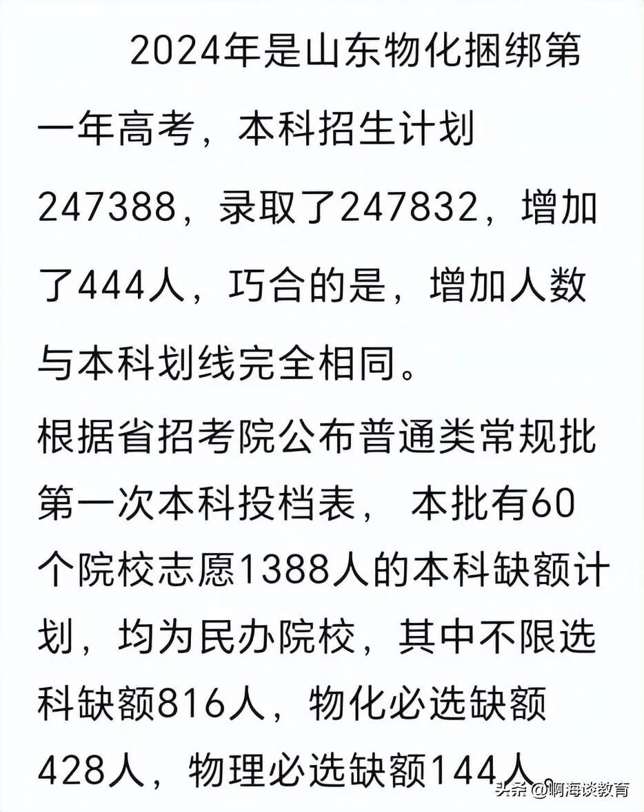 2024年,山东高考一段线是444分,按照往年的经验,高于一段线15-20分,是能够有本科读的,但是今年情形却大大相反,文科生高于本科线15分是完全没有本科读的,文科500分以下,基本上没有公办本科可以读,475分以上才有民办本科可以上,而物化捆绑的理科生,今年就大占便宜了,只要上了本科线444分基本上就有公办本科可以读。