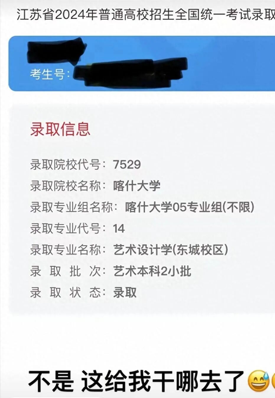 这两天各地陆续出了大学录取结果,很多考生也在网上晒出自己的录取信息,其中有江苏一位考生,晒出他被喀什大学录取的信息,并在后面吐槽到,这给我干哪去了?显然这位考生还没有做好被新疆的大学录取的准备。当他得知被喀什大学录取的时候,估计他都不知道喀什在哪里。等他翻开地图一查,距离好几千公里的时候。才会发出这样的吐槽。