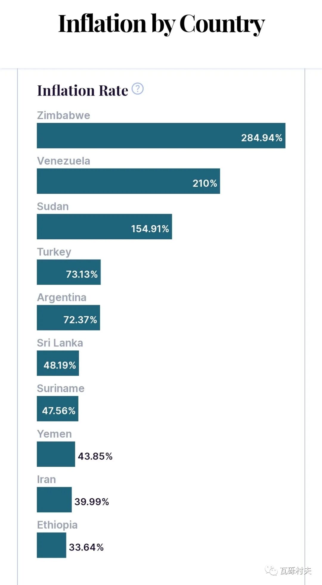 2022年通货膨胀率最高的十个国家:津巴布韦,委内瑞拉,苏丹,土耳其,阿根廷,斯里兰卡,苏里南 也门,伊朗,埃塞俄比亚(数据源:国际货币基金组织)