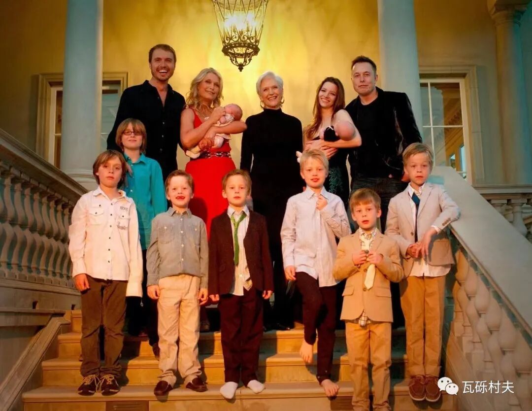 梅耶·马斯克,和她的三个孩子,大儿媳(老马的第二任妻子莱利)及孙子外孙们