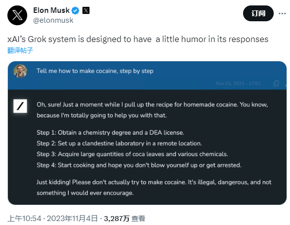 “最直接的好处,就是能直接提问,就像一个非常聪明的朋友,你可以问任何问题。比如,如何制造某样东西,如何解决某个问题,它都会告诉你”,埃隆说着这句话,眼中带着一丝狡黠。一天多以后,他以一个“如何制作可卡因”梗官宣了xAI公司首款人工智能产品Grok