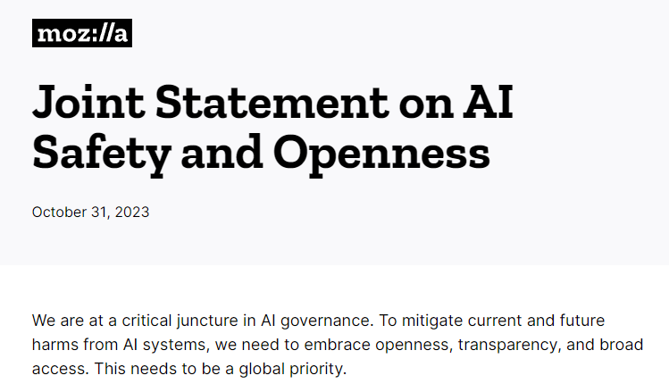 峰会召开前一天10月31日,一封由Mozilla基金会发表,名为《人工智能安全和开放的联合声明》的公开信迅速传播。公开信呼吁人工智能研发的“开源与开放”。截至目前,深度学习三教父之一的杨立昆、斯坦福大学计算机科学系教授吴恩达等370多人已经在这封公开信上签名。