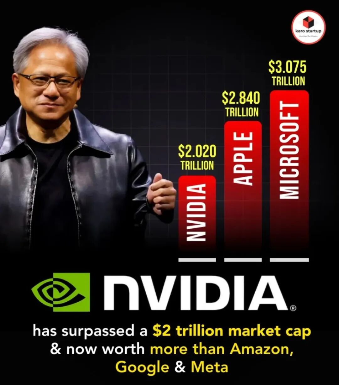 2月23日盘中,Nvidia公司市值首次突破2万亿美元,紧跟微软和苹果公司之后,已超越亚马逊、谷歌和Meta。图:karo startup