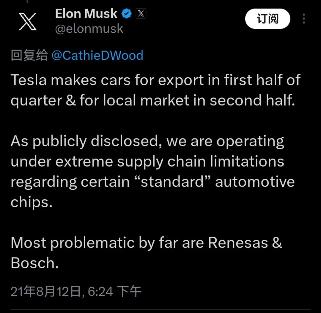 21年8月,特斯拉仍然面临供应链芯片紧缺,埃隆在回复木头姐的一个帖子中称:“正如公开披露的那样,在某些‘标准’汽车芯片方面,我们的供应链受到了极大的限制。目前问题最大的是瑞萨和博世”