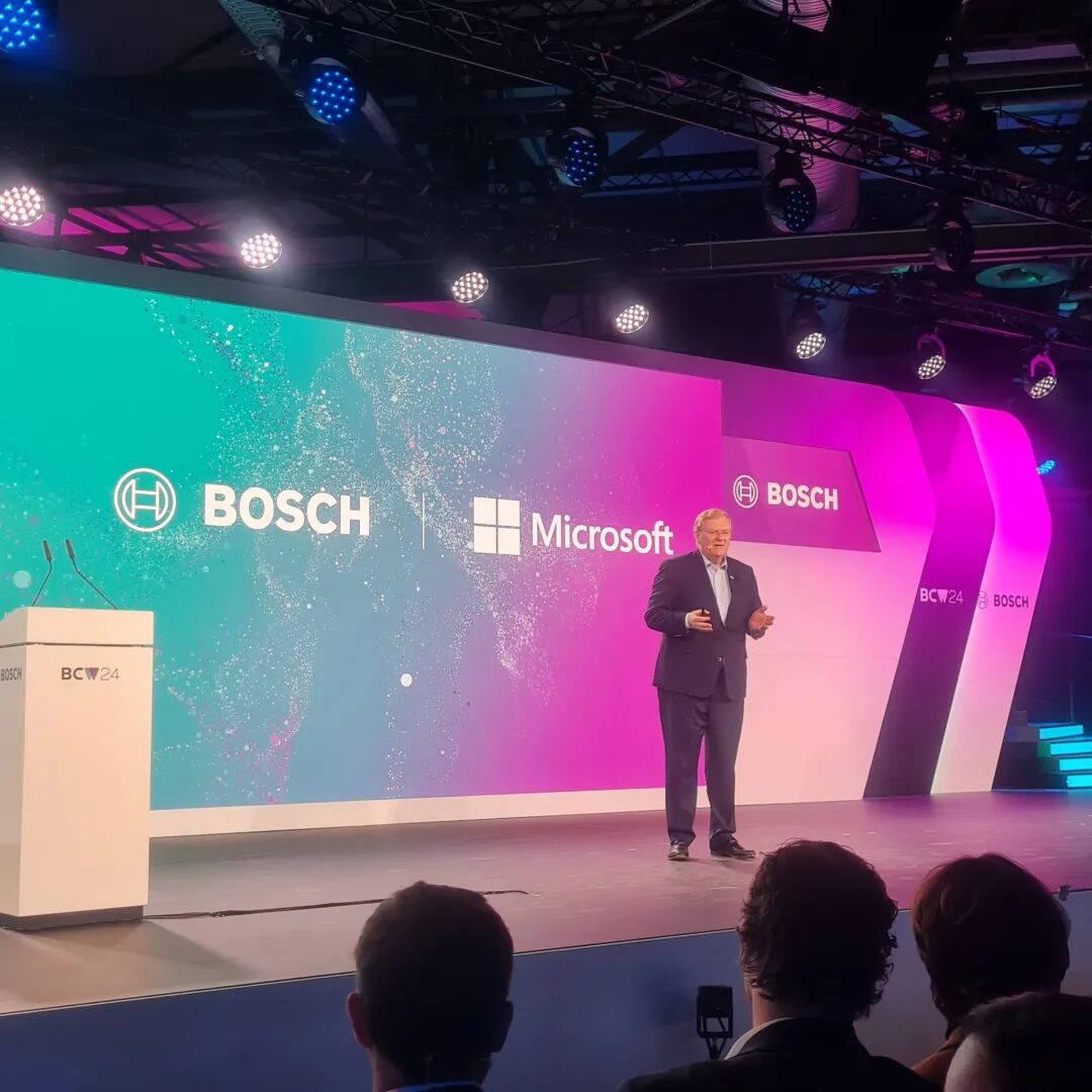 本次访谈前一天2月28日,博世与微软发布声明称,双方正联手以生成式AI技术开发自动驾驶产品。图为博世CEO斯特凡在“博世互联世界2024”大会上介绍这一合作:“博世正致力于将人工智能应用引入汽车”