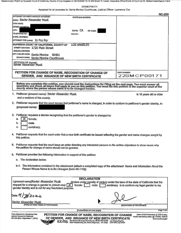 2022年4月,在18岁生日后的第三天,埃隆家的老二泽维尔(Xavier,2004年和双胞胎哥哥格里芬Griffin一起出生)在加州圣莫尼卡提交了法庭申请,要求将自己的性别从男性变更为女性,将自己的名从泽维尔改为薇薇安(Vivian),将自己的姓从马斯克改为母姓威尔逊(Wilson)。