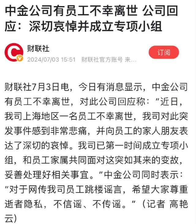 中金公司迅速作出回应,澄清了这起悲剧并非网传的跳楼事件,而是一起突发事件,且与降薪、裁员等言论无关。