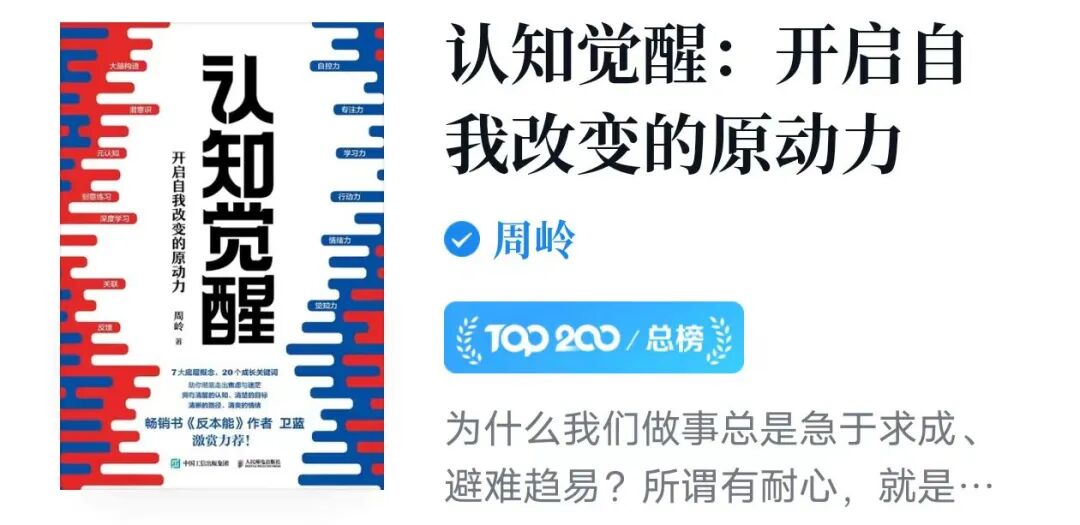 如果说,《认知觉醒》给我一种醍醐灌顶的感觉,这本书就像一位长者在我耳边轻声细语,既没有说教也没有苦口婆心,而是用实际行动告诉我,怎么做事,怎么持续做事,怎么几十年如一日的持续做事。