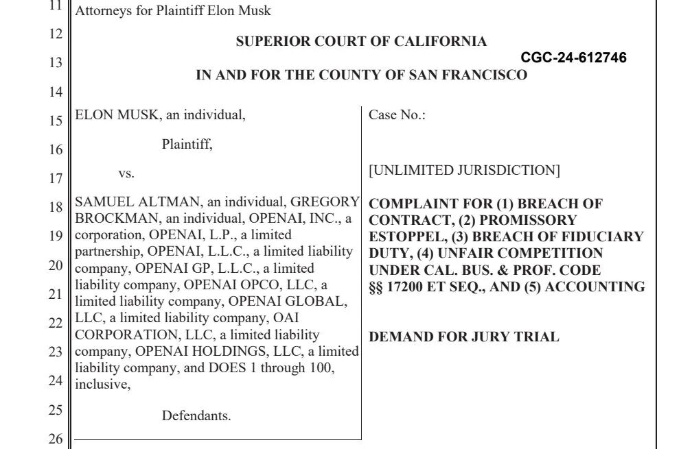 2月29日,马斯克提起诉讼,指控萨姆·奥特曼(Sam Altman)及他所创立的人工智能研究公司OpenAI背离了其成立之初致力于为人类利益而非利润开发人工智能技术的协议。