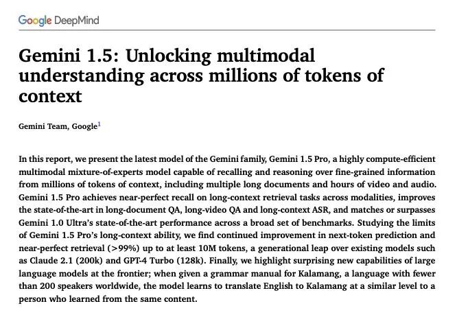 谷歌发布双子座Gemini 1.5 pro 模型技术报告及更新 :在数百万个语境标记中实现多模态理解 。报告中介绍了 Gemini 系列的最新型号--Gemini 1.5 Pro,它是一种计算效率极高的多模态专家混合模型