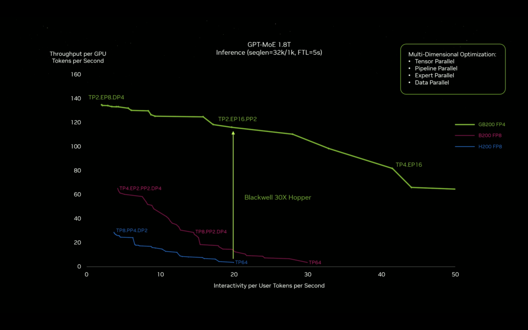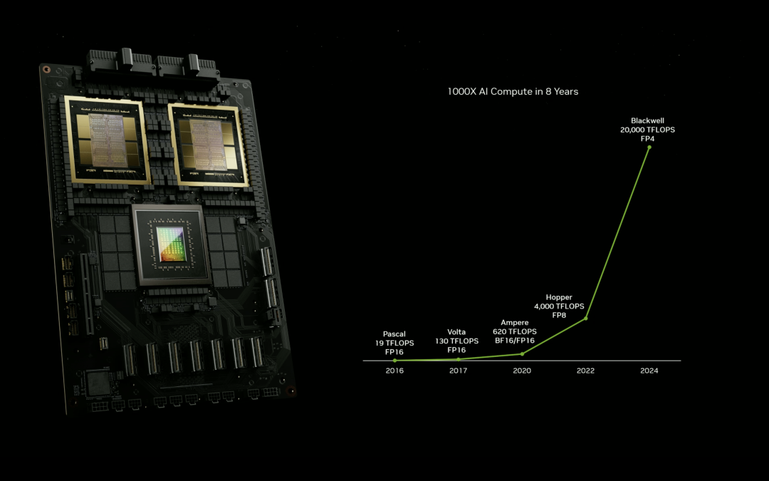 为了满足生成式 AI 对计算能力的需求,黄仁勋推出了 Blackwell 平台。Blackwell (B200芯片)平台在 FP8 训练性能方面比上一代 Hopper 架构(H200芯片)提高了 2.5 倍,在 FP4 推理性能方面提高了 5 倍。它还配备了第五代 NVLINK 互连技术,速度是 Hopper 的两倍,可扩展至 576 个 GPU