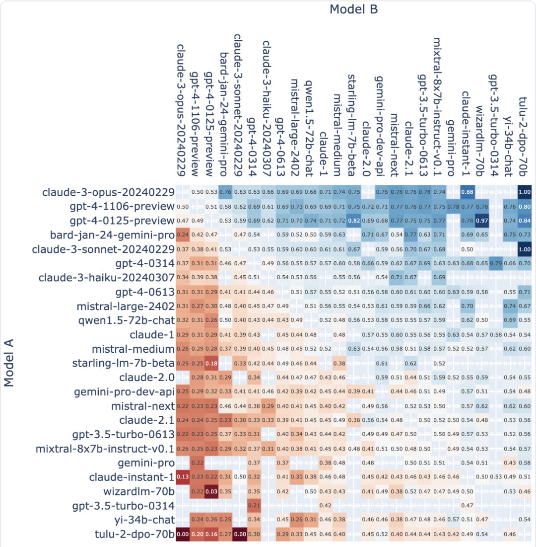 相对于所有其他模型的平均胜率(假设均匀采样且无平局)