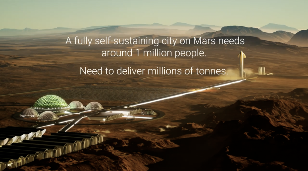 火星城市: 建立一个自给自足的火星城市需要大约 100 万人口和数百万吨货物。SpaceX 计划在 20 年内实现这一目标