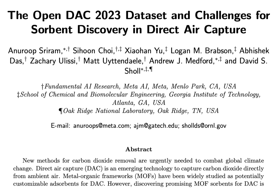 OpenDAC项目是Meta基础人工智能研究中心(FAIR)和佐治亚理工学院之间的合作研究项目,旨在显着降低直接空气捕获(DAC)的成本