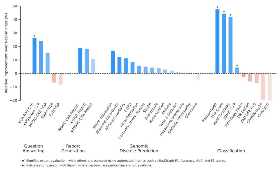Med-Gemini-2D/3D/Polygenic 通过自动指标和人类专家的严格评估,在医学 VQA、报告生成(CXR 和 CT)、基因组学疾病风险预测和医学影像分类等方面设定了新的标准,并在一系列基准中表现出色