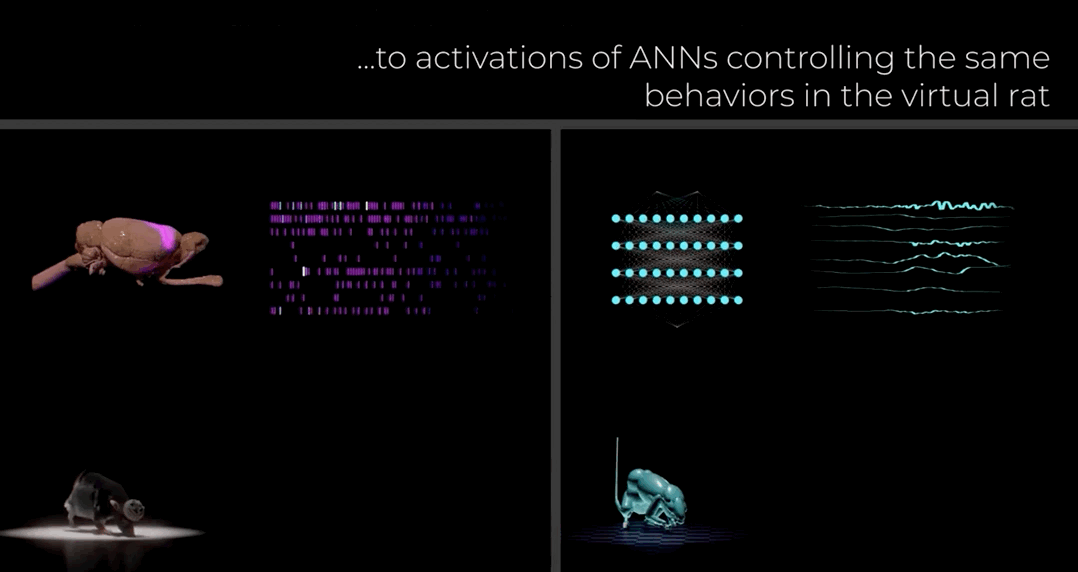 简单来说研究人员首先在物理仿真环境中创建了一个虚拟老鼠模型,并训练其人工神经网络"大脑"去模仿真实老鼠的全身运动。然后,他们将虚拟老鼠神经网络的激活模式与真实老鼠大脑的神经活动进行了对比