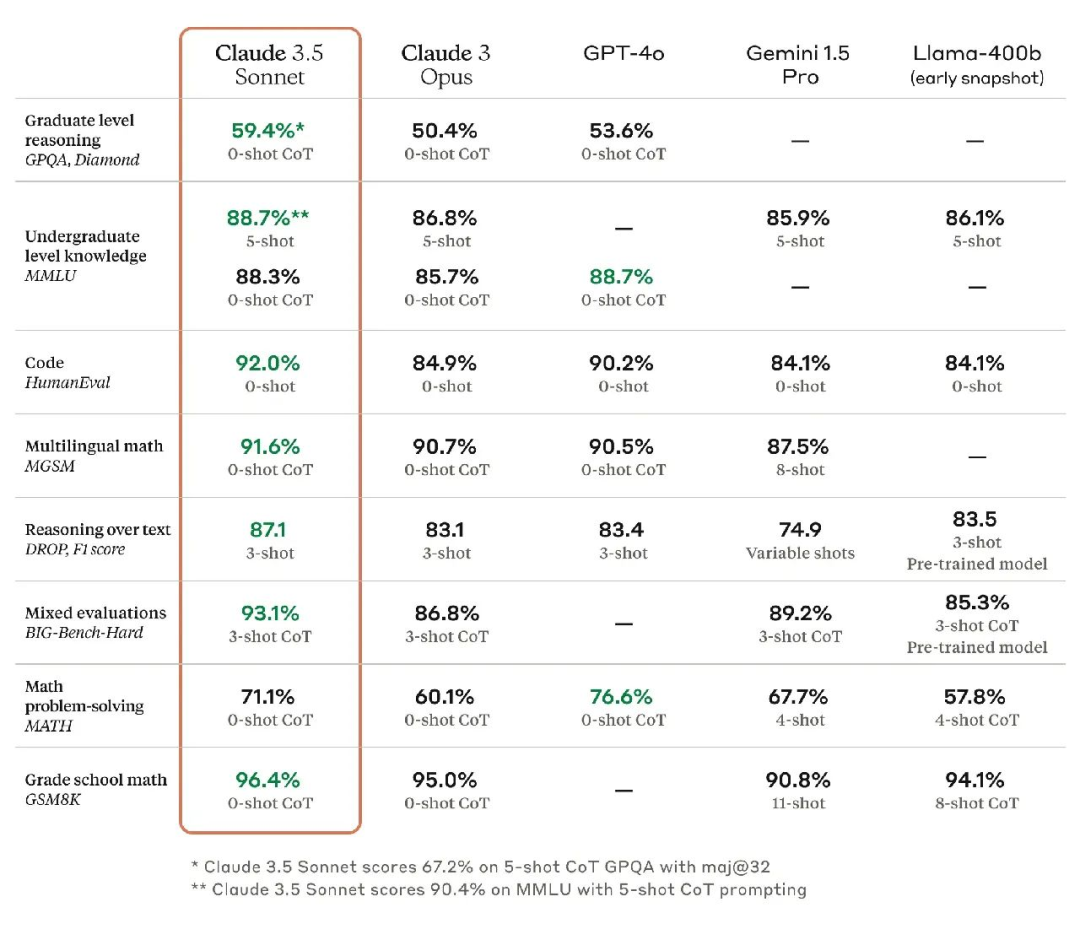 从图中我们可以明显看出,Claude 3.5 Sonnet已经成为Anthropic最先进的模型,具体性能表现如下: