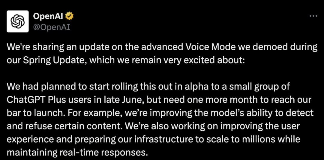 我们原计划在六月底开始向少部分ChatGPT Plus用户推出alpha版本,但需要再花一个月时间才能达到发布标准。例如,我们正在提升模型检测和拒绝不当内容的能力。我们也在改进用户体验,并准备我们的基础设施,以确保在扩展到数百万用户时仍能保持实时响应