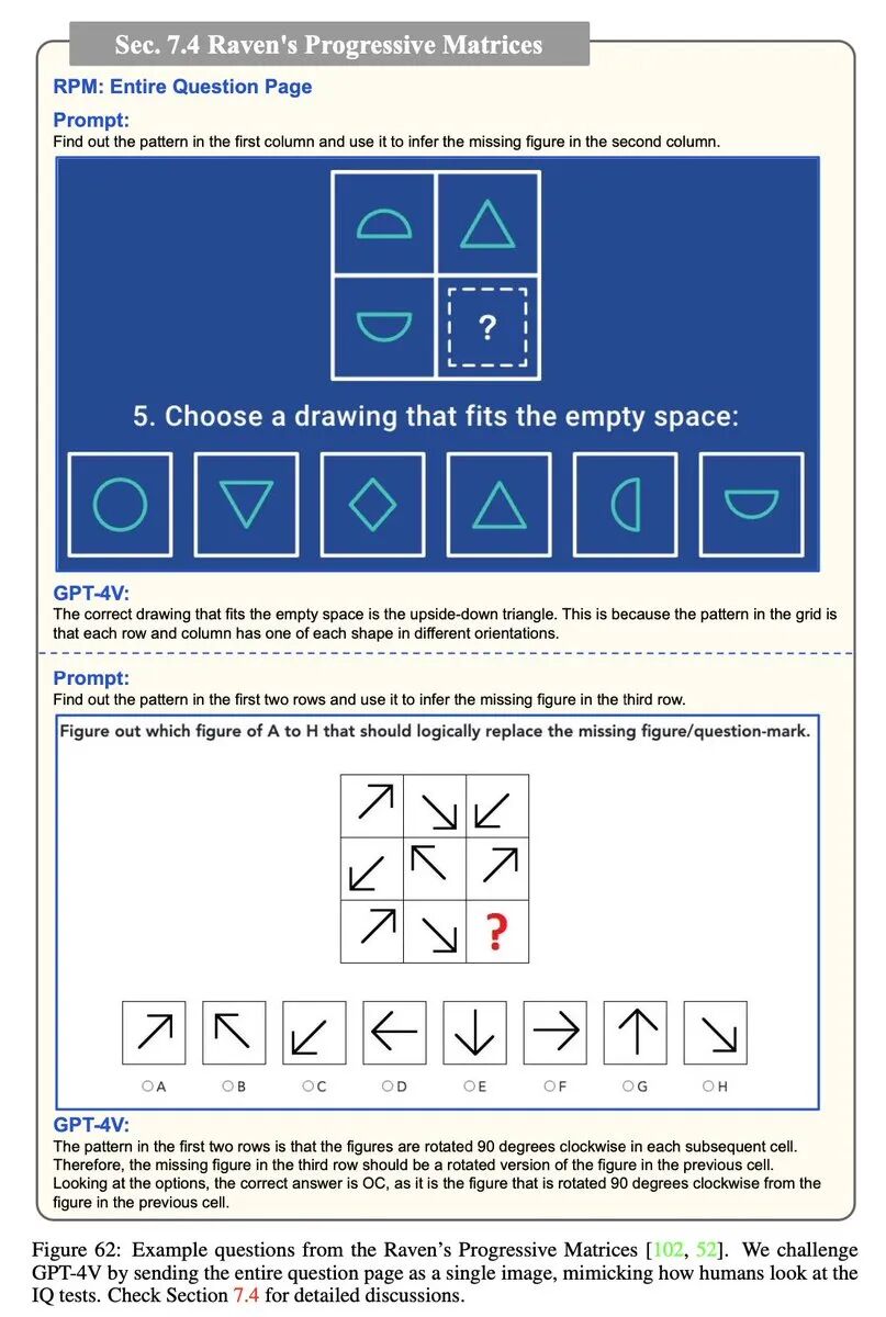 4)GPT-4V 能从视觉信号中抽象出语义,并能执行人类智商测试,结果和人类相当