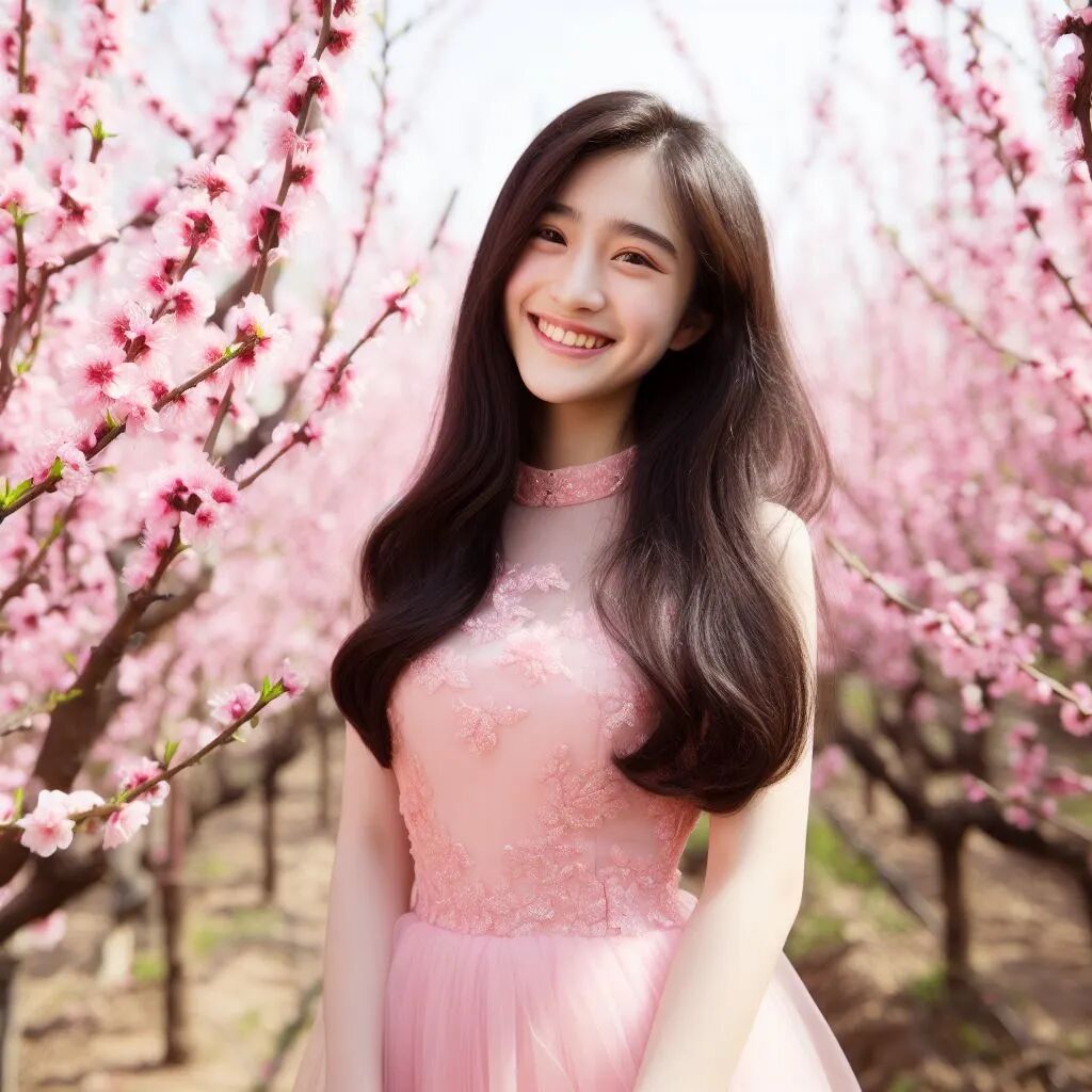 提示词: 在春天的桃花林中,一位笑容灿烂的中国女孩穿着粉色的裙子,与花朵相映成趣