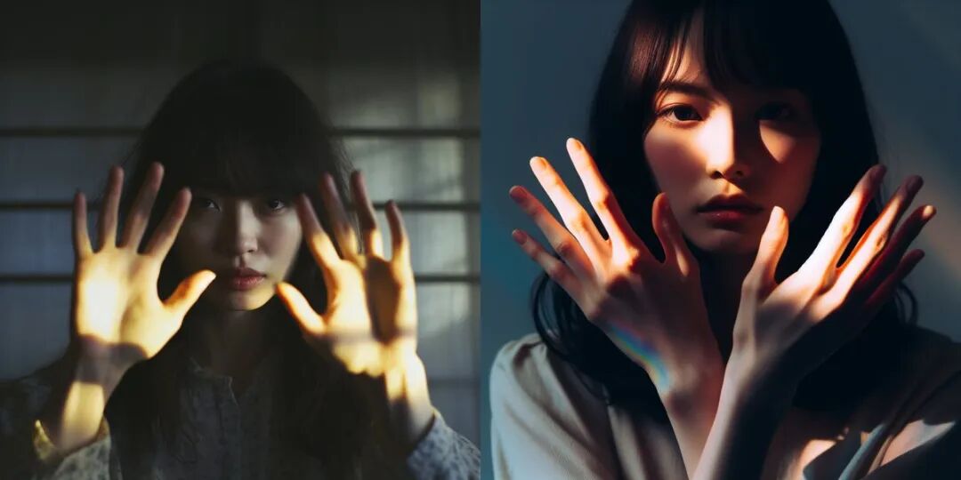 提示词:在灯光下双手掩面的女性,具有重光的视觉美学风格,柔和光线下的肖像,朦胧的阴影,棱镜肖像,鲜明的面部特征