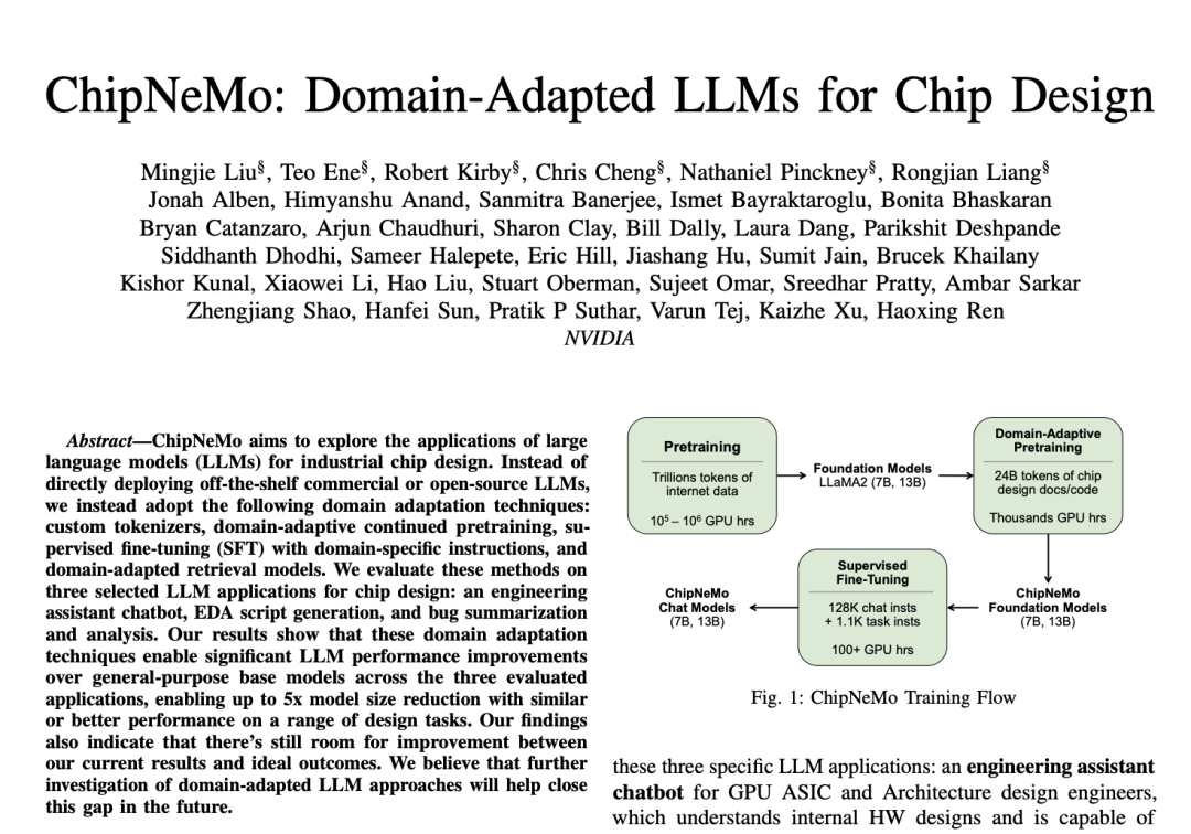 NVIDIA英伟达今日发布了一项研究论文,详细描述了生成式人工智能在芯片设计这一高度复杂工程领域的应用。这一研究揭示了专业领域的企业如何巧妙地利用内部数据,通过训练大型语言模型(LLM)来构建提高生产力的助手。