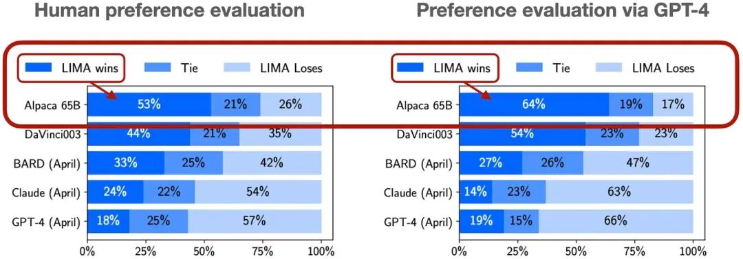使⽤ LIMA 论⽂中的⼈类和 GPT-4 偏好评估的示例