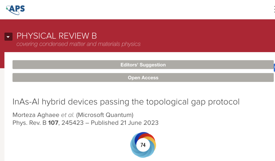 要达到规模,需要一个基础物理的突破。微软已经实现了这个突破,并今天在美国物理学会的一份期刊PRB中发布了经过同行评审的数据。