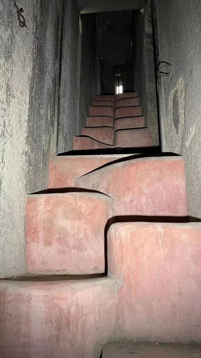 首先这栋楼高25.6米,它是没有层的概念,空间就像是搭积木,从外面看像一座从地底冒出的堡垒,几乎没有门窗,但内部却是明亮的。整栋建筑全部用的钢筋混凝土,所有的家具均由混凝土浇制,每一个位置每一处都安排得明明白白。给你分好左右脚的/只能一人通过的楼梯、歪七扭八且没有扶手、层高不足1.7米、每层没有门都是开放空间、到处都是叠水池、迷宫一样的内部设计。