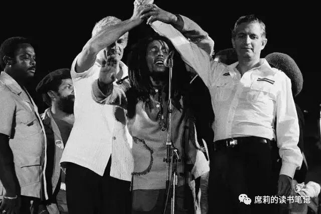 在音乐会上,马利将牙买加总理迈克尔·曼利(Michael Manley)和他最大的政敌西加的手握在一起。