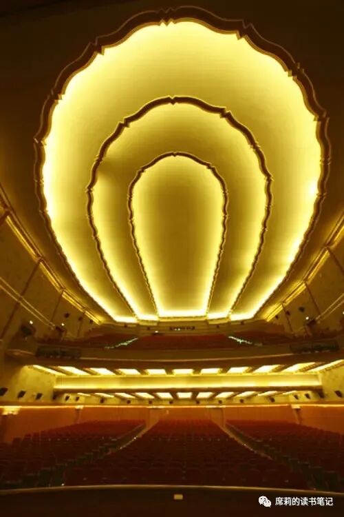 流畅的圆弧曲线从大厅顶部环绕整个电影院。意大利大理石砌成抽象图案,屋顶装饰为层叠的荷花形。