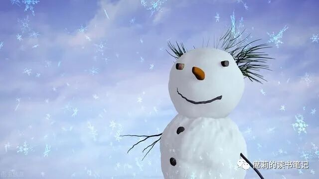他当圣诞礼物送给妈妈的粉色围巾,就围在雪人的脖子上,一排由黑色卵石组成的眼睛和嘴巴在月光下闪烁,雪人凝视着屋子,仿佛在微笑……