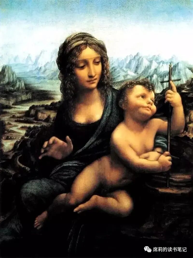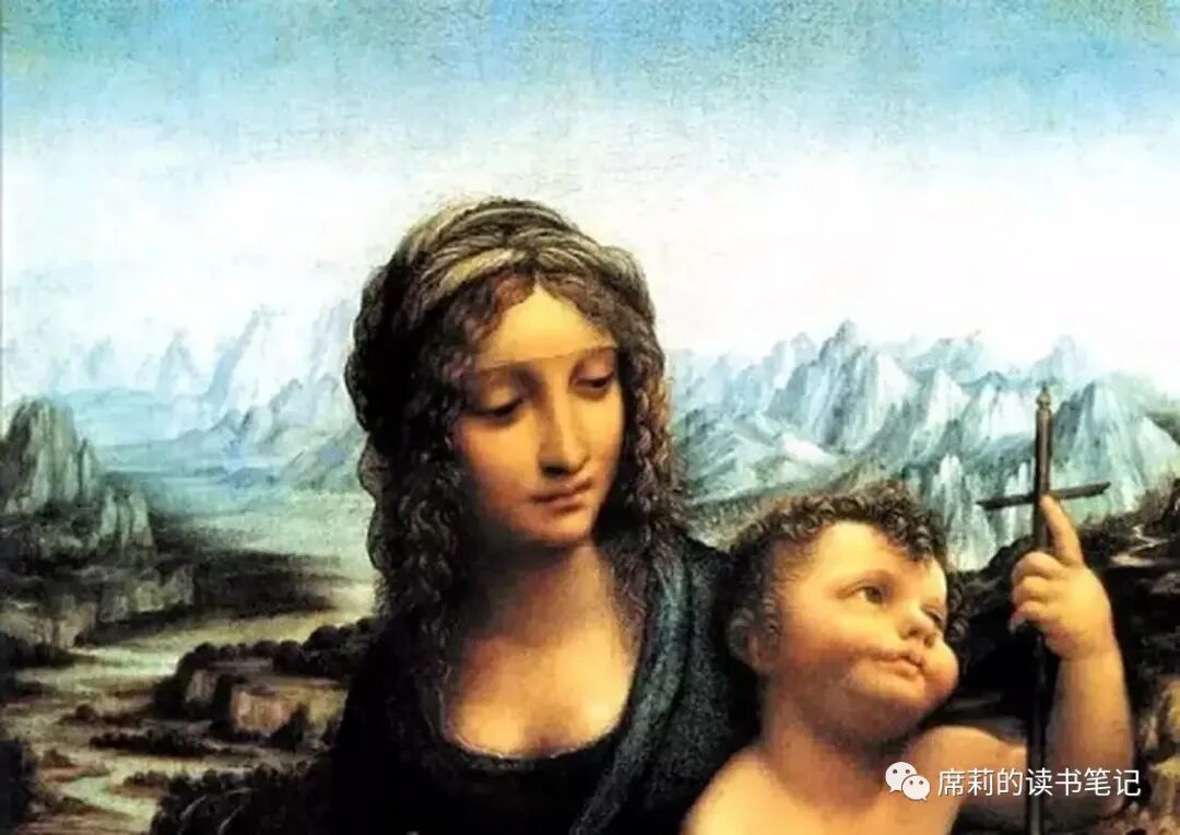 母子俩的金色卷发,远处迷蒙的山上流淌下来的河水,薄雾的反光,耶稣倚靠的岩石,等等,都与达·芬奇对光影和科学的理解一脉相承。