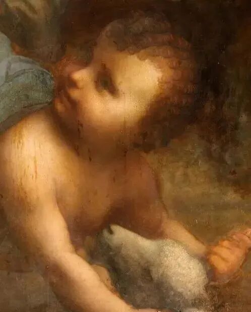 如今通过红外反射成像分析,年幼的耶稣和羊羔都在右侧,而不在左侧。从中可以看出,达·芬奇为这幅画作设计了多种方案。