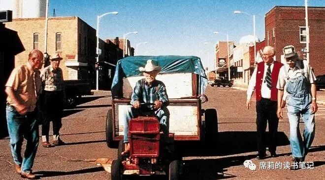 影片中以老割草机代替汽车作为交通工具,象征着人在年老时,力不从心的感受。