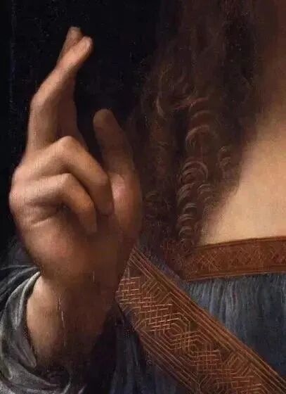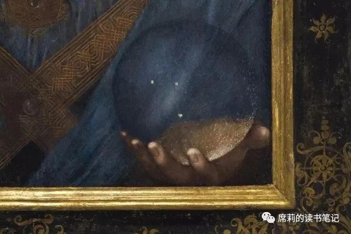 达·芬奇准确地捕捉到了夹杂物的闪光。另外,他还精准地表现出水晶球压在基督手掌上,看起来更加平滑和明亮的感觉。