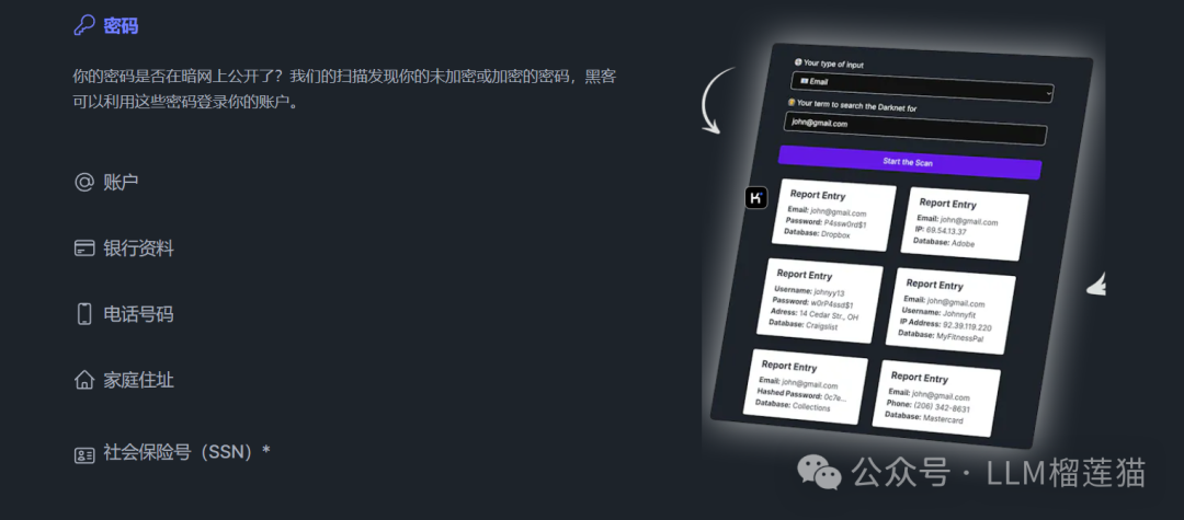 用户可以通过该网站扫描暗网,查找与自己相关的各种信息泄露情况: