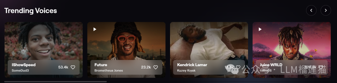 MusicfyAI支持用户在Drake、A妹和Lammar等等欧美顶流歌手之间选择,用户可以上传自己的音频文件,选择想要模仿的艺术家,平台会分析并应用所选艺术家的风格到上传的声音文件上。