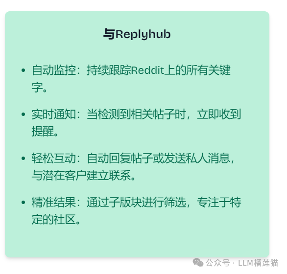 当出现和产品关键字有关的帖子时候自动进行回复,全流程流量都可观测可控,还能对潜在的用户进行私信冷启动。