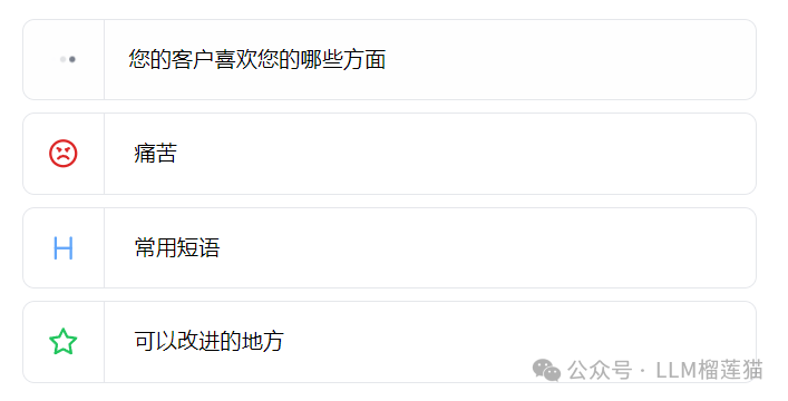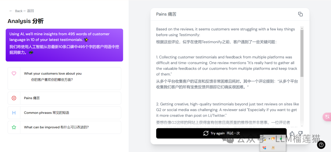 大模型AI分析收集到的所有评价,生成四大方面的用户反馈报告,帮助创业者更好地分析并改进自身的产品。
