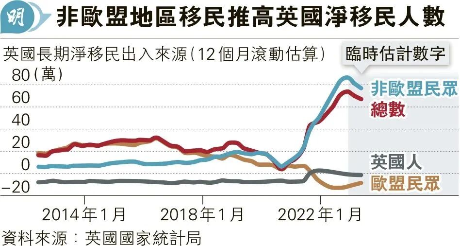 英国最新政府数据显示,英国去年的净移民人数达到破纪录的74.5万人,当局承认数字「太高」,正采取措施应对,又指移民人数近期已见回落,包括来自香港的英国国民(海外)签证持有人。
