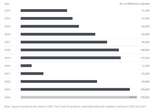 Henlay & Partners分析的数据显示,在2020年之前,财富迁移一直在稳步加速,2018年约有108,000名高净值人士移民,而2017年为95,000人,2016年为82,000人,2015年为64,000人。然而,2019 年底 Covid-19 大流行的爆发以及 2020 年和 2021 年的相关封锁和旅行限制严重阻碍了所有人的全球流动。报告指出:2022年和2023年的数据显示经济迅速复苏,预计2024年将是破纪录的一年,百万富翁移民将达到历史上最大规模,达到12.8万人。