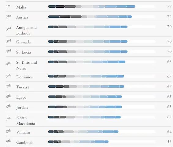 根据亨利公民身份计划指数,马耳他、奥地利、安提瓜和巴布达以及格林纳达成为 2024 年全球投资公民计划排名前列的国家。该报告以全球公民计划指数和全球居住计划指数为特色,对全球最有价值的居住和投资公民计划进行了系统分析和全面对比,提供了该行业的黄金标准。